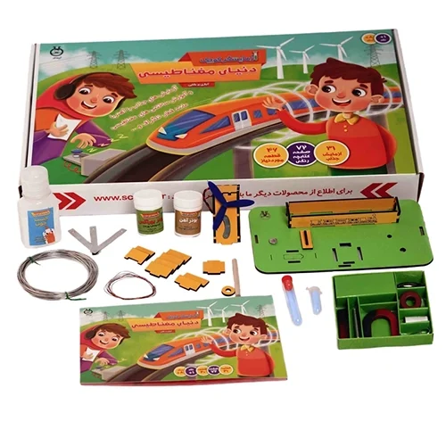 آهنربای نعلی، دو عدد آهنربای حلقوی، آهنربای دو قلو، آهنربا نِئودونیم، میکروتیوب، لوله آزمایش، سیم مسی بدون روکش، چسب چوب، گیره کاغذ، سیم مسی، نخ، گیره کاغذ، پیچ، صفحه اصلی و قطعات مختلف چوبی، برج موتور الکتریکی، پودر آهن، پودر بوراکس، دفترچه راهنما