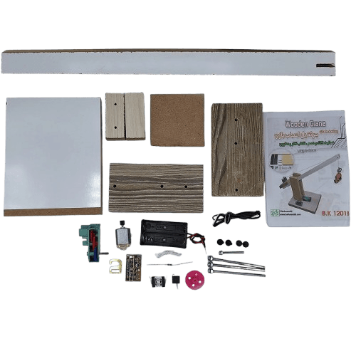 کیت ساخت جرثقیل چوبی کاروفناوری پایه نهم، شامل تمامی قطعات چوبی برش‌خورده و قطعات الکترونیکی، مناسب آموزش عملی مکانیک و الکترونیک به همراه موتور و گیربکس قوی.