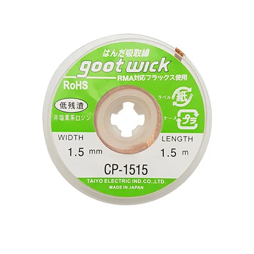سیم قلع کش حلقه ای GOOT WICK مدل CP-1515 برای برداشتن قلع های اضافی از روی برد الکترونیکی می باشد.