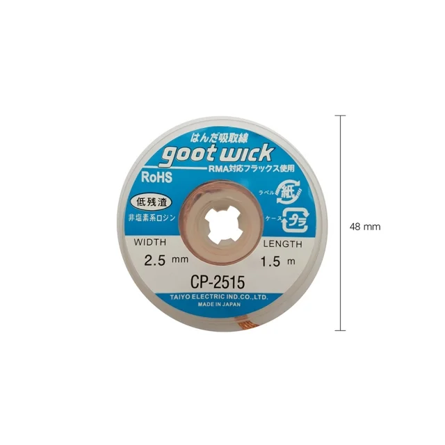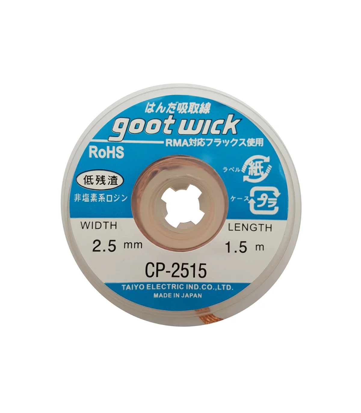 سیم قلع کش حلقه ای GOOT WICK مدل CP-2515 برای برداشتن قلع های اضافی از روی برد الکترونیکی می باشد.