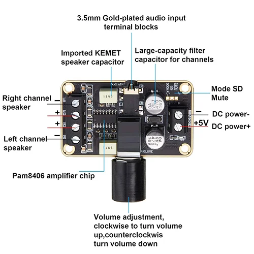 ابتدا، به ماژول تغذیه 5 ولت پایدار و قابل اعتماد وصل کنید. معمولاً دو پایه ورودی برق در ماژول وجود دارد که به منبع تغذیه وصل میشوند.یک منبع صوتی، مانند یک تلفن همراه یا پخشکننده MP3، را به سرریزهای ورودی ماژول متصل کنید. در اینجا باید اطمینان حاصل کنید که سیگنال صوتی به درستی وارد سرریزهای ورودی شده است.اتصال بلندگوها به سرریزهای خروجی ماژول را برقرار کنید. از مراعات کنید که بلندگوها به درستی با سیمهای خروجی اتصال یابند و همچنین متوجه شوید که هماهنگی امپدانس بلندگو با ماژول صورت گرفته است (به عنوان مثال، اگر مقاومت خروجی ماژول 8 اهم است، بلندگوها نیز باید 8 اهم باشند). در صورت نیاز، میتوانید با استفاده از یک مقاومت پتانسیومتر (potentiometer)، حجم صوت را تنظیم کنید. برای این کار، میتوانید مقاومت پتانسیومتر را در مسیر سیگنال بین منبع صوتی و سرریزهای ورودی ماژول قرار دهید.