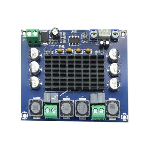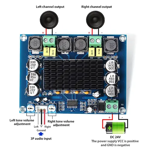 این ماژول آمپلیفایر استریو 120 وات با تراشه TPA3116D2، یک تقویتکننده صوتی دیجیتال دو کاناله با کیفیت بالا است که برای تامین انرژی لازم برای بلندگوهای استریو و سابووفرها طراحی شده است. این ماژول با استفاده از چیپ TPA3116D2، توان خروجی 120 وات بر هر کانال را ارائه میدهد و قادر است صداهای قوی و با جزئیات را بازتولید کند. خروجی صدای این ماژول از کیفیت بسیار خوبی برخوردار است و در ساخت آن از قطعات با کیفیت بالا استفاده شده است. ولتاژ ورودی این ماژول از 12 تا 24 ولت DC پشتیبانی میکند (توصیه میشود از 24 ولت DC برای دستیابی به حداکثر توان خروجی و کیفیت صدا استفاده شود).