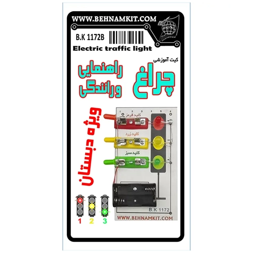 کیت کاردستی چراغ راهنمایی، یک بسته آماده از تمامی قطعات برای ساخت چراغ راهنمایی شامل سه عدد لامپ رنگی، سه عدد کلید، جاباتری (باتری)، سیم، پیچ و تخته پلاستیکی است. این کیت بهطور ویژه برای کاردستی مدارس و کلاس چهارم طراحی شده و امکان یادگیری عملی اصول اولیه الکترونیک و ساخت مدار را فراهم میکند.