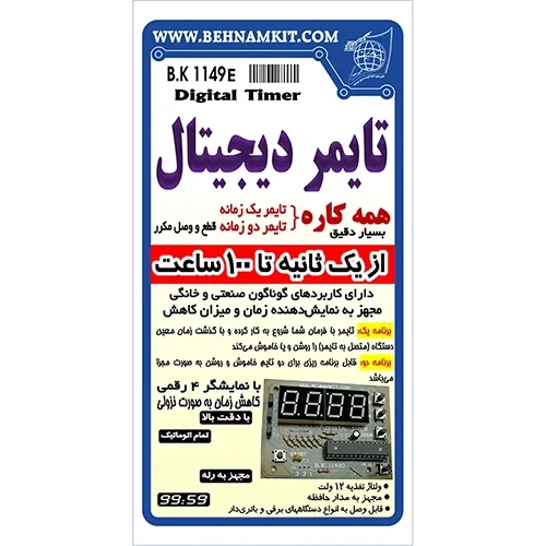 کیت تایمر دیجیتال دو برنامه با بازه زمانی ۱ ثانیه تا ۱۰۰ ساعت، دارای حالت یک‌زمانه و دو‌زمانه، تغذیه ۱۲ ولت و مناسب کاربردهای صنعتی و خانگی.