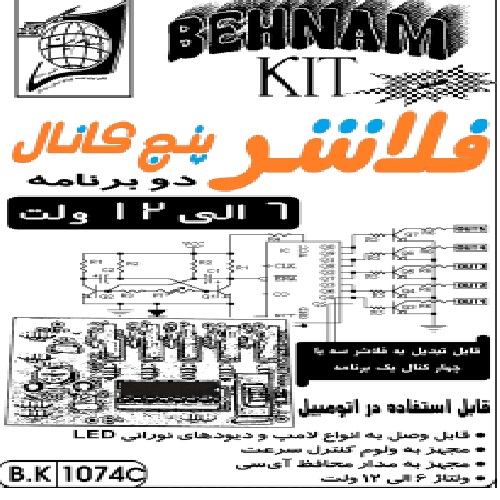 کیت فلاشر پنج کانال دو برنامه، یک مدار الکترونیکی کاربردی با عملکرد پاندولی است که از پنج کانال خروجی مستقل با قابلیت کنترل سرعت تشکیل شده و دارای دو برنامه حرکتی میباشد. در برنامه اول، حرکت نور به صورت یکطرفه انجام میشود و در برنامه دوم، حرکت به صورت رفت و برگشتی (پاندولی) اجرا میگردد. این کیت قابلیت تبدیل به فلاشر سه یا چهار کانال با یک برنامه را نیز دارد.