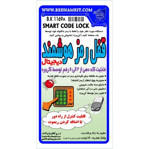 کیت قفل رمز هوشمند با کیبورد و قابلیت افزودن ریموت، دارای رمز 2 تا 8 رقمی، سه حالت خروجی و حافظه داخلی، مناسب کنترل ایمن انواع دستگاه‌ها.