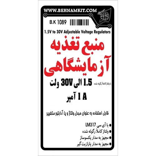 کیت منبع تغذیه آزمایشگاهی DC رگوله‌شده با خروجی قابل تنظیم 1.5 تا 30 ولت و جریان 1 آمپر، مبتنی بر آی‌سی LM317 و مناسب برای مبدل ولتاژ یا دیمر DC.
